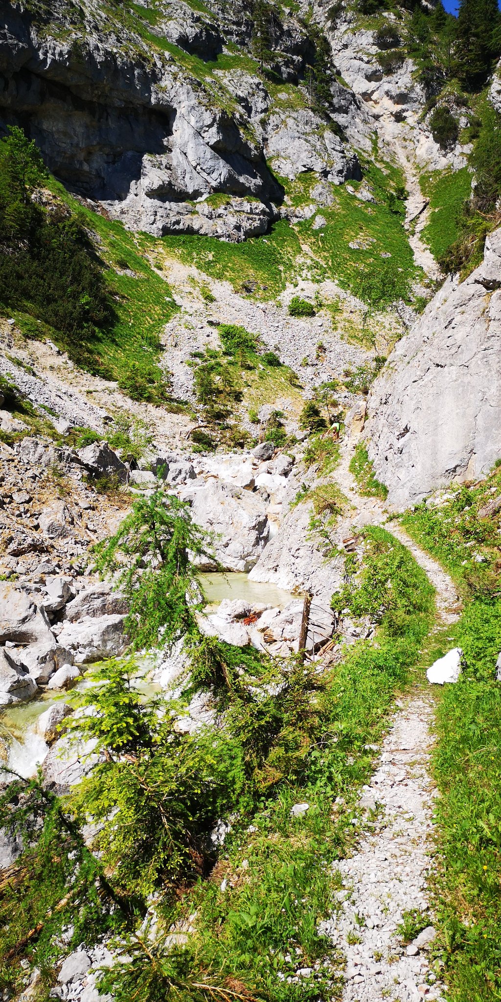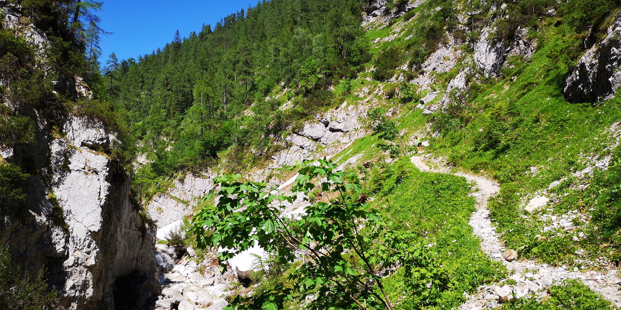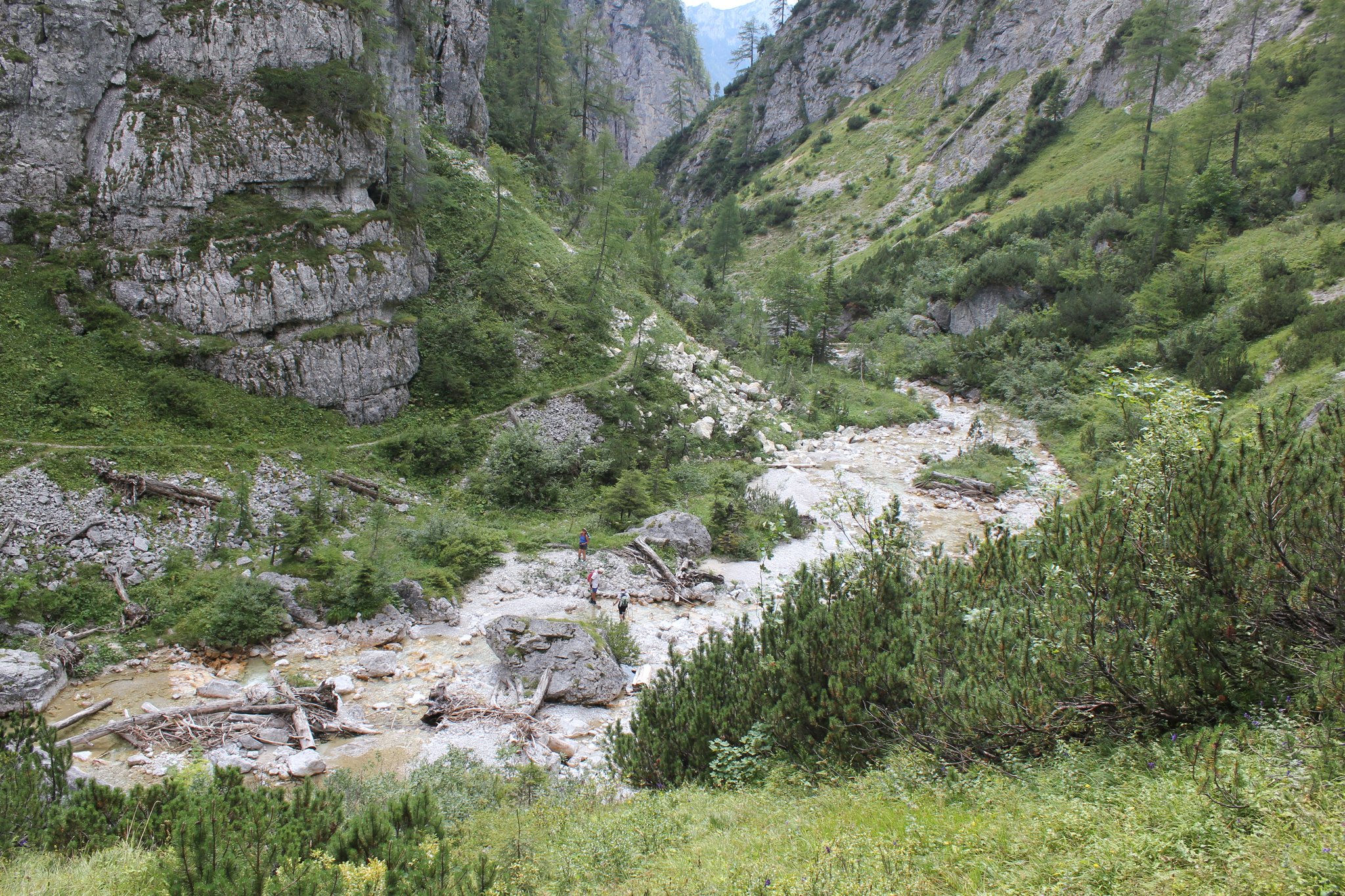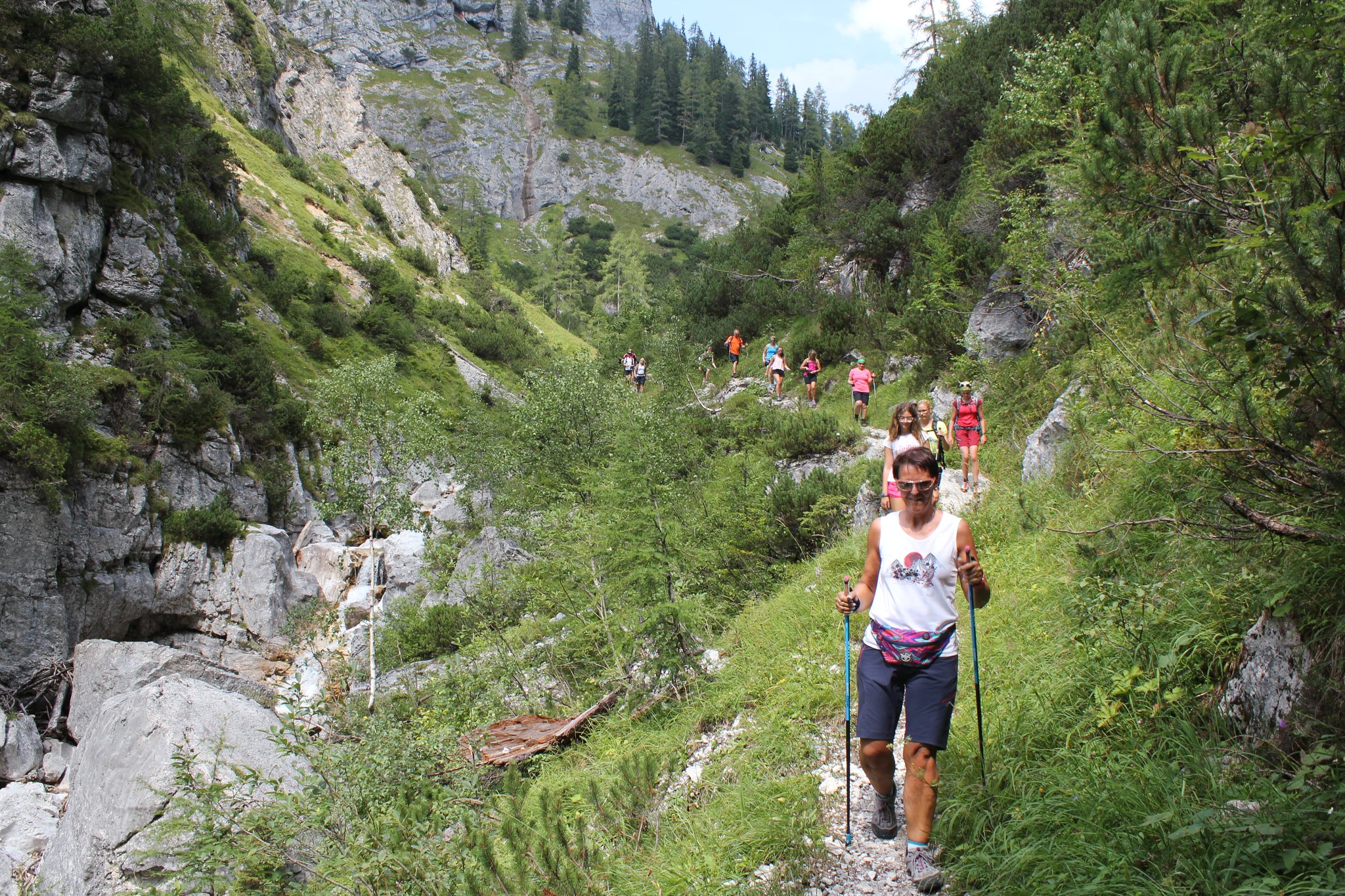 Nach den Hütten halten wir uns rechts, kommen an einem Brunnen vorbei, wo der Wanderweg in den Wald weiterführt und nach kurzer Zeit der faszinierende Abstieg in die Grimmingschlucht beginnt. Hier schlängelt sich in Serpentinen der steinige Steig abwärts, wir queren noch 2mal einen kleinen Bachlauf bis wir, zunächst noch durch ein kleines Waldstück laufend, zum Grimmingbach gelangen. Ab hier beginnt eines der schönsten Teilstücke dieser Runde durch die Grimmingschlucht. Nachdem wir uns kurz am kristallklaren und eiskalten Wasser etwas erfrischt haben, überqueren wir die Grimming über eine kleine Brücke. Nach einem kurzen Anstieg gabelt sich der Steig und wir halten uns rechts Richtung Gnanitz. Unter uns schlängelt sich nun die wild tobende und ungestüme Grimming mit ihrem kristallklaren, smaragdgrünen Wasser durch die Schlucht und bietet uns ein impossantes Naturschauspiel. Am Ende der Schlucht gelangen wir in einen Buchenwald und laufen den Forstweg weiter bis wir wieder zu einer Wegkreuzung gelangen. Hier haben wir die Möglichkeit entweder den Weg geradeaus Richtung Gnanitzalm zu nehmen und nach einer Stärkung in einer der bewirtschafteten Almhütten den Weg fortzusetzen oder rechts den Forstweg über die Brücke Richtung Ausgangspunkt weiterzulaufen. Bei beiden Varianten verlaufen die letzten 8 km auf einer Forst- und zuletzt auf einer Asphaltstrasse, bis wir unseren Ausgangspunkt wieder erreicht haben.