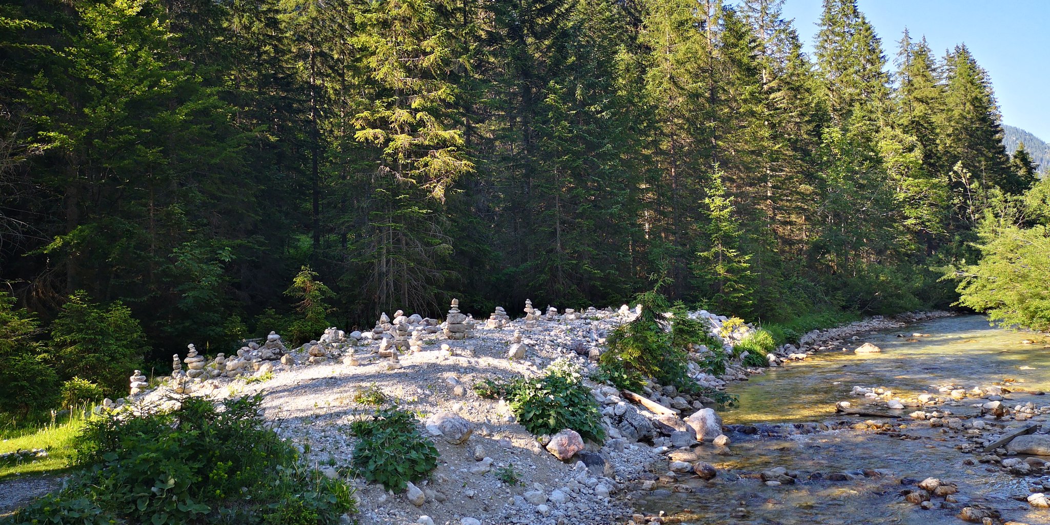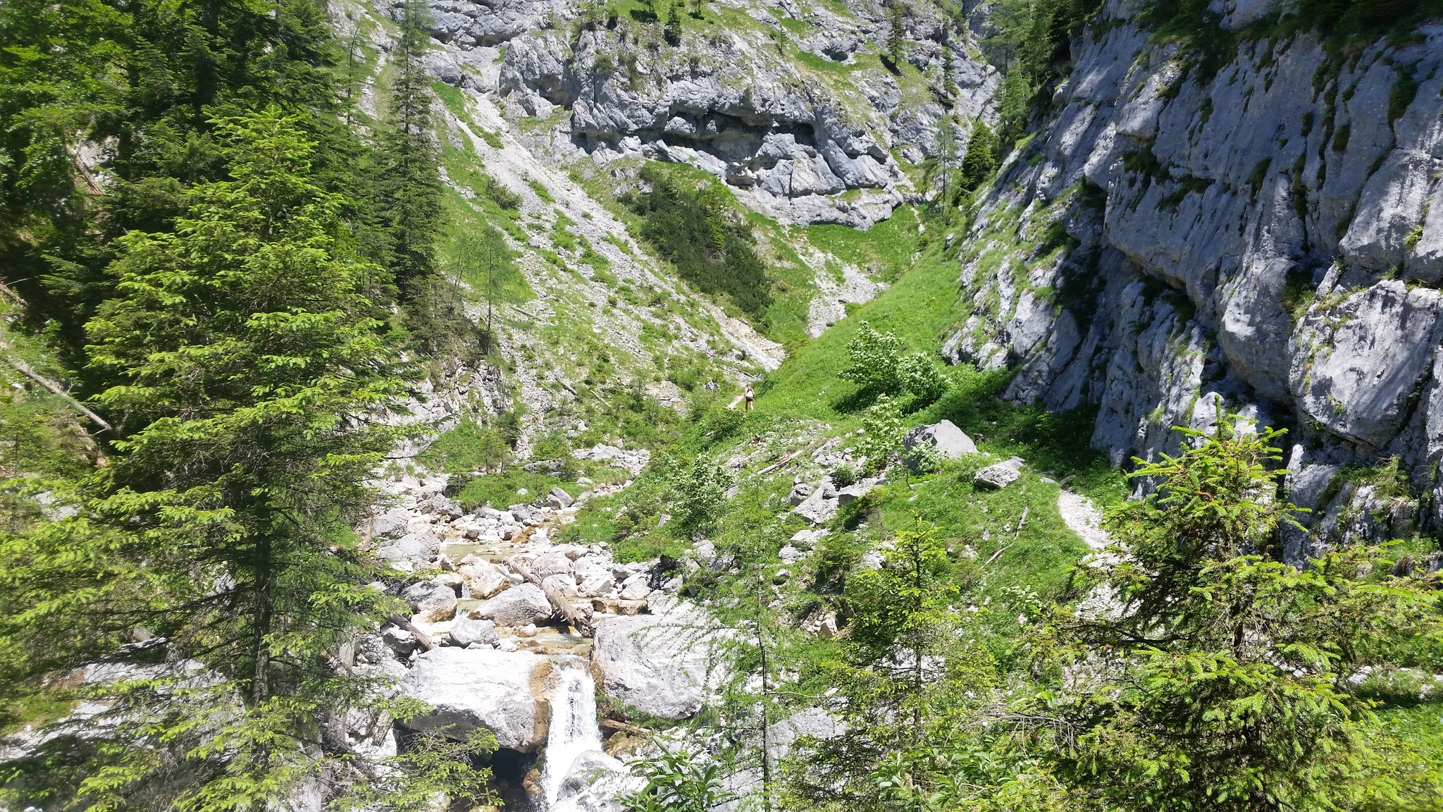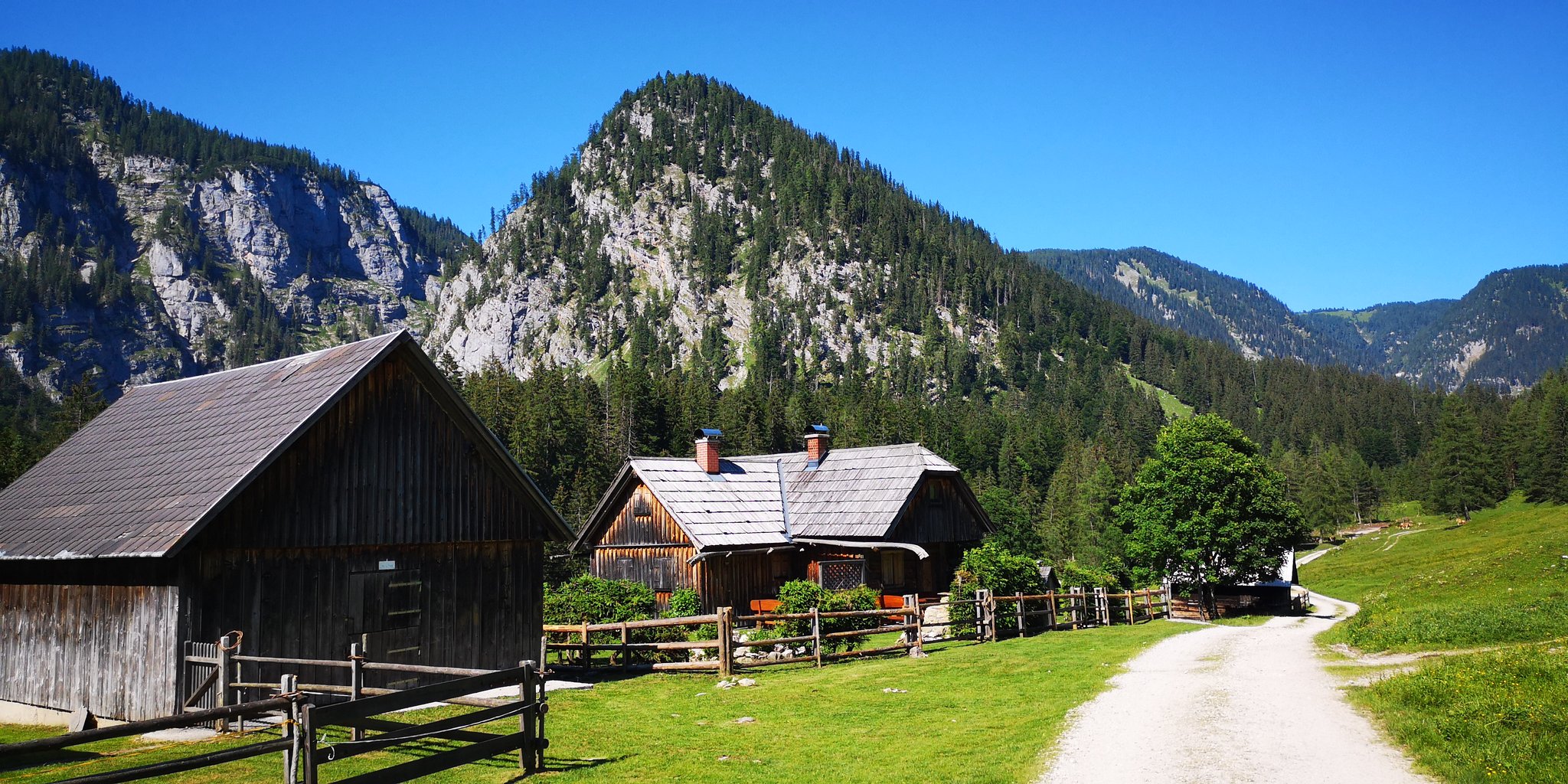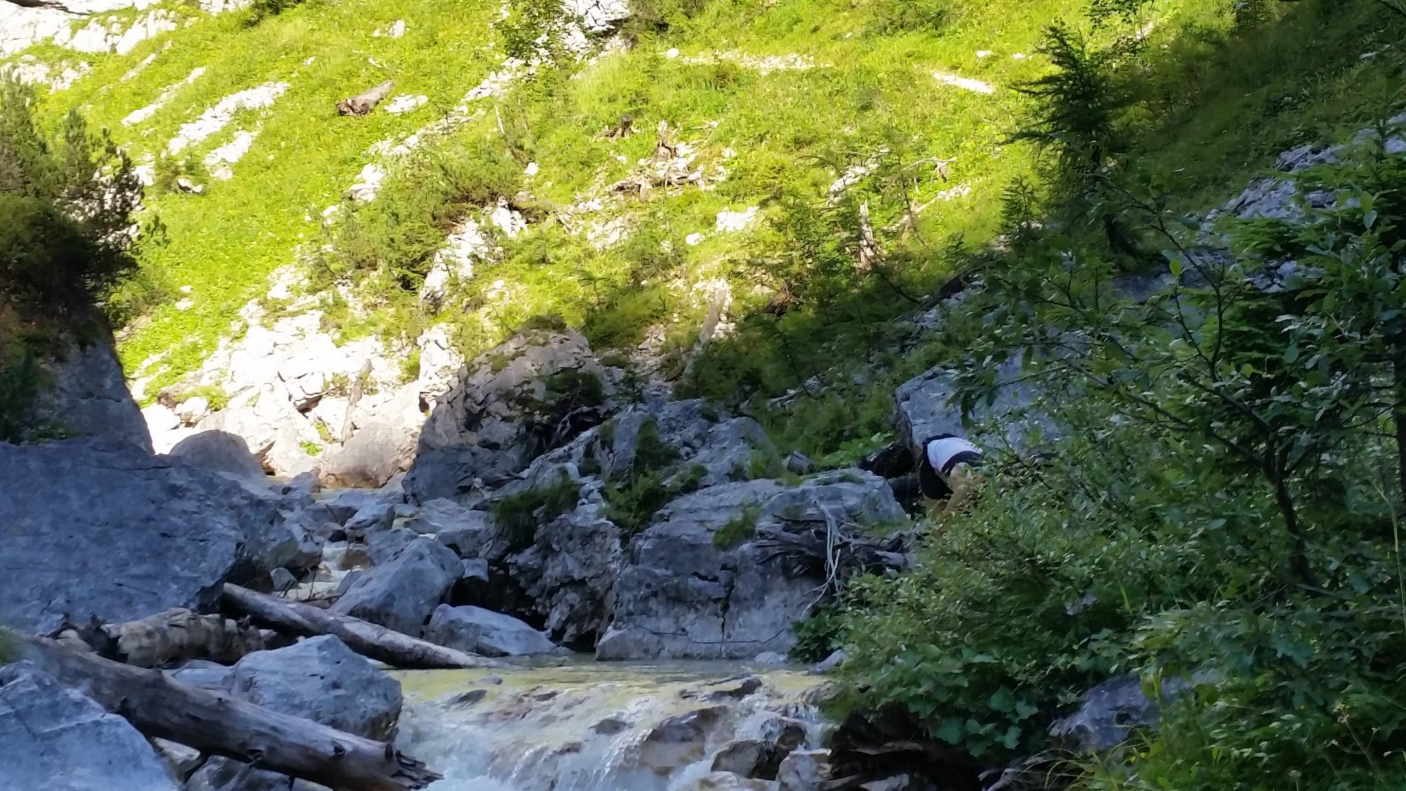 Nach den Hütten halten wir uns rechts, kommen an einem Brunnen vorbei, wo der Wanderweg in den Wald weiterführt und nach kurzer Zeit der faszinierende Abstieg in die Grimmingschlucht beginnt. Hier schlängelt sich in Serpentinen der steinige Steig abwärts, wir queren noch 2mal einen kleinen Bachlauf bis wir, zunächst noch durch ein kleines Waldstück laufend, zum Grimmingbach gelangen. Ab hier beginnt eines der schönsten Teilstücke dieser Runde durch die Grimmingschlucht. Nachdem wir uns kurz am kristallklaren und eiskalten Wasser etwas erfrischt haben, überqueren wir die Grimming über eine kleine Brücke. Nach einem kurzen Anstieg gabelt sich der Steig und wir halten uns rechts Richtung Gnanitz. Unter uns schlängelt sich nun die wild tobende und ungestüme Grimming mit ihrem kristallklaren, smaragdgrünen Wasser durch die Schlucht und bietet uns ein impossantes Naturschauspiel. Am Ende der Schlucht gelangen wir in einen Buchenwald und laufen den Forstweg weiter bis wir wieder zu einer Wegkreuzung gelangen. Hier haben wir die Möglichkeit entweder den Weg geradeaus Richtung Gnanitzalm zu nehmen und nach einer Stärkung in einer der bewirtschafteten Almhütten den Weg fortzusetzen oder rechts den Forstweg über die Brücke Richtung Ausgangspunkt weiterzulaufen. Bei beiden Varianten verlaufen die letzten 8 km auf einer Forst- und zuletzt auf einer Asphaltstrasse, bis wir unseren Ausgangspunkt wieder erreicht haben.