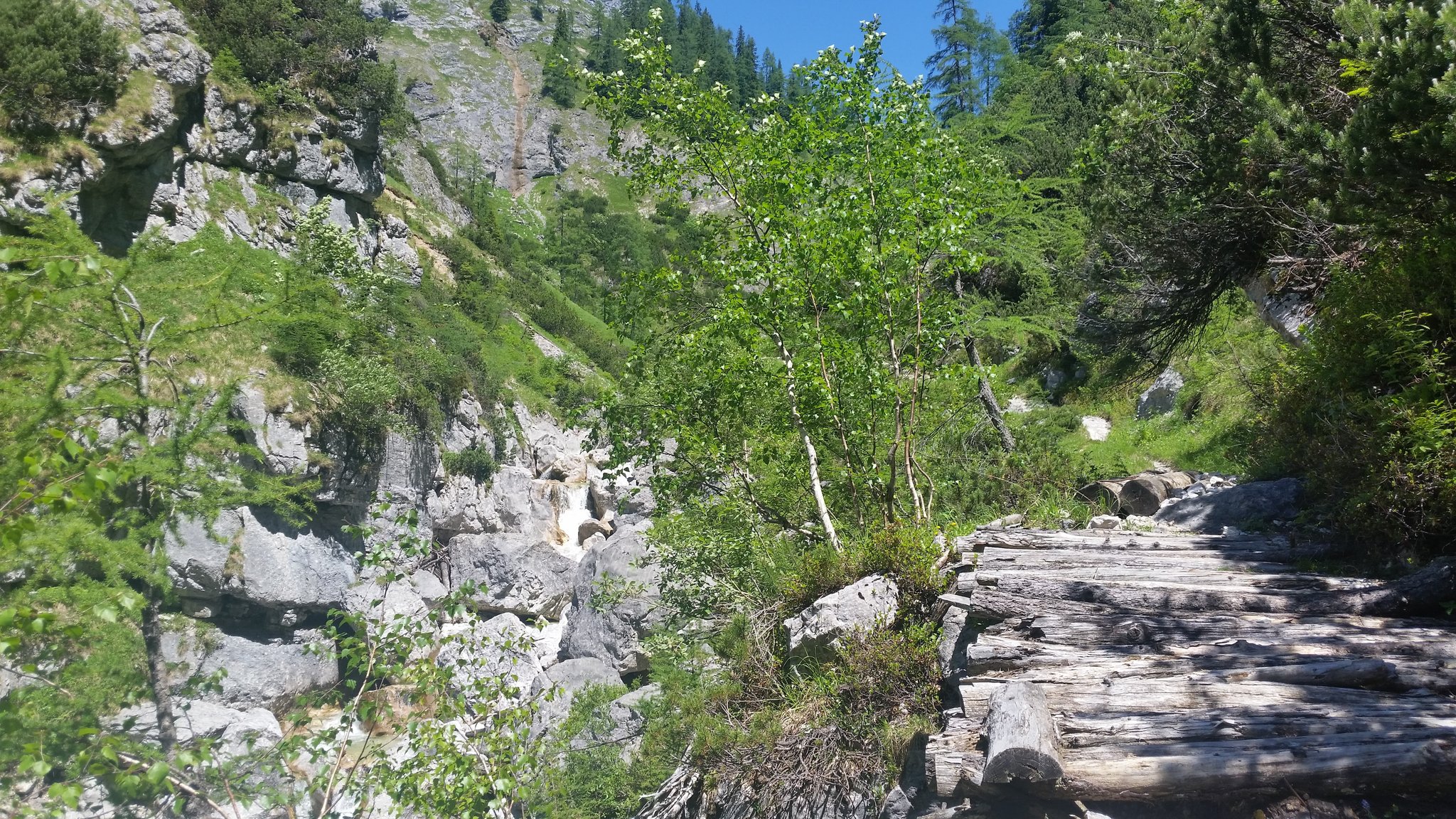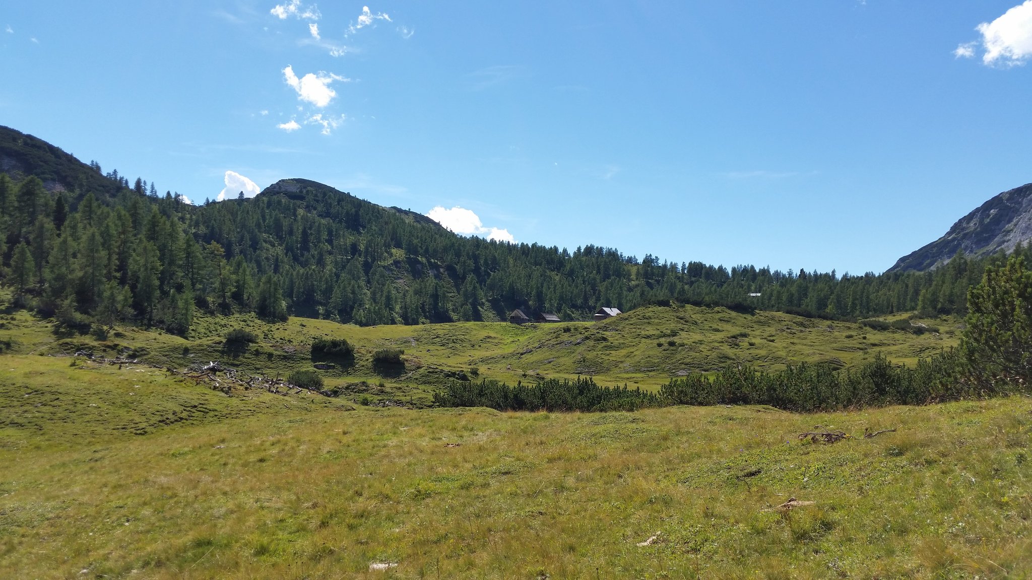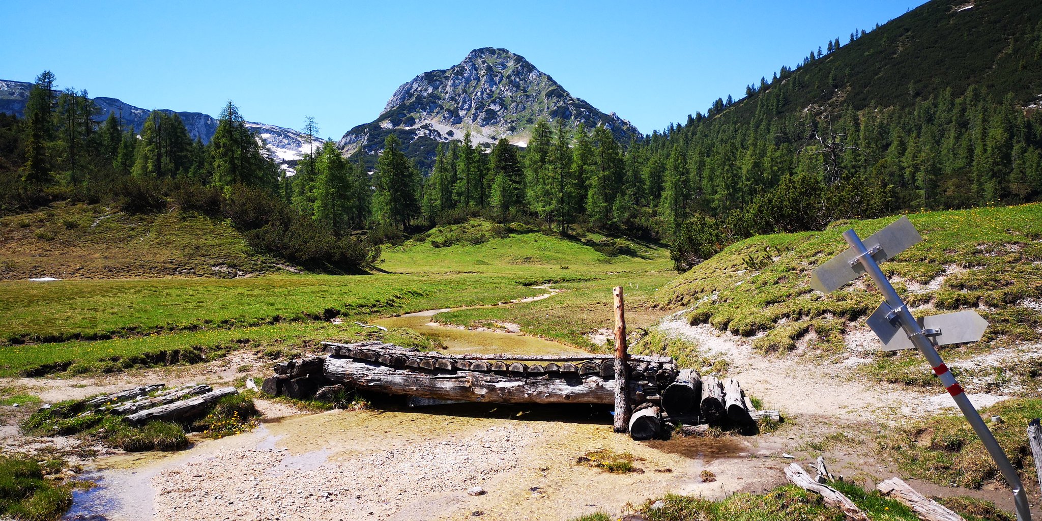 Nach der Jagdhütte beginnt ein wunderschönes flaches Teilstück über einen, im Sommer mit den verschiedensten Almblumen übersäten Almteppich. Immer wieder kreuzt ein kleiner Bach, der sich durch diesen Almboden schlängelt und den wir über einen kleinen Steg überqueren bis wir zur im Sommer ebenfalls bewirtschafteten Interhüttenalm gelangen.