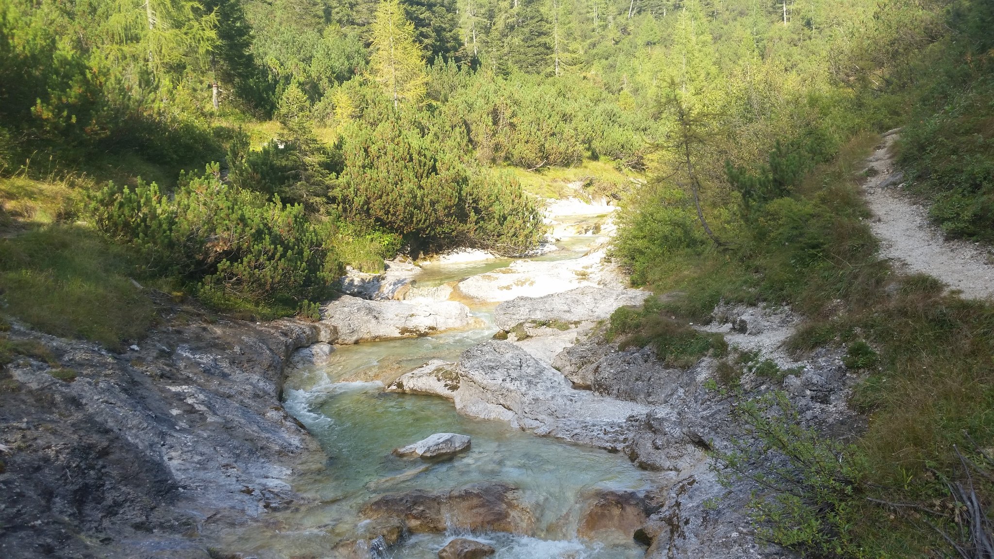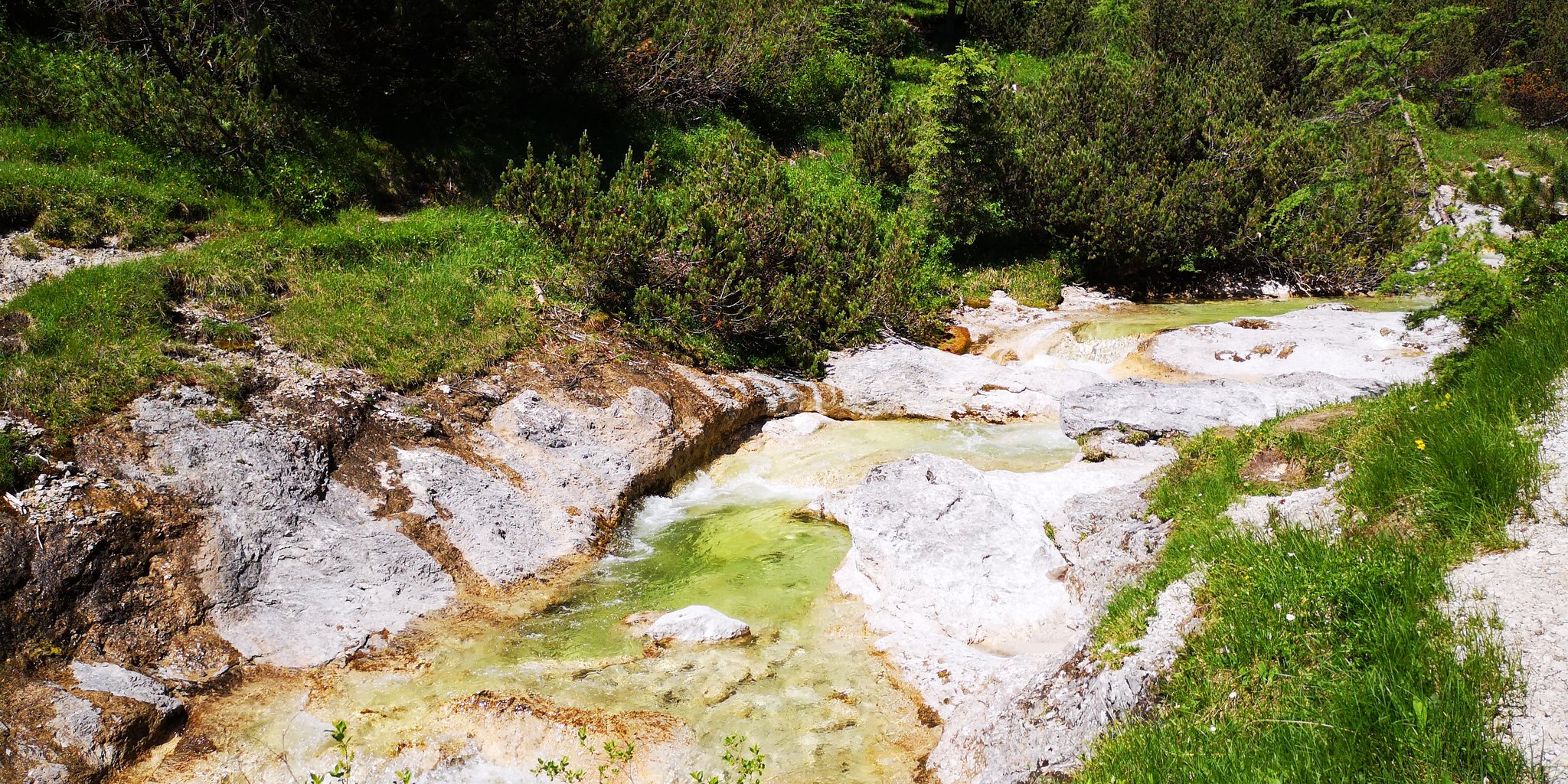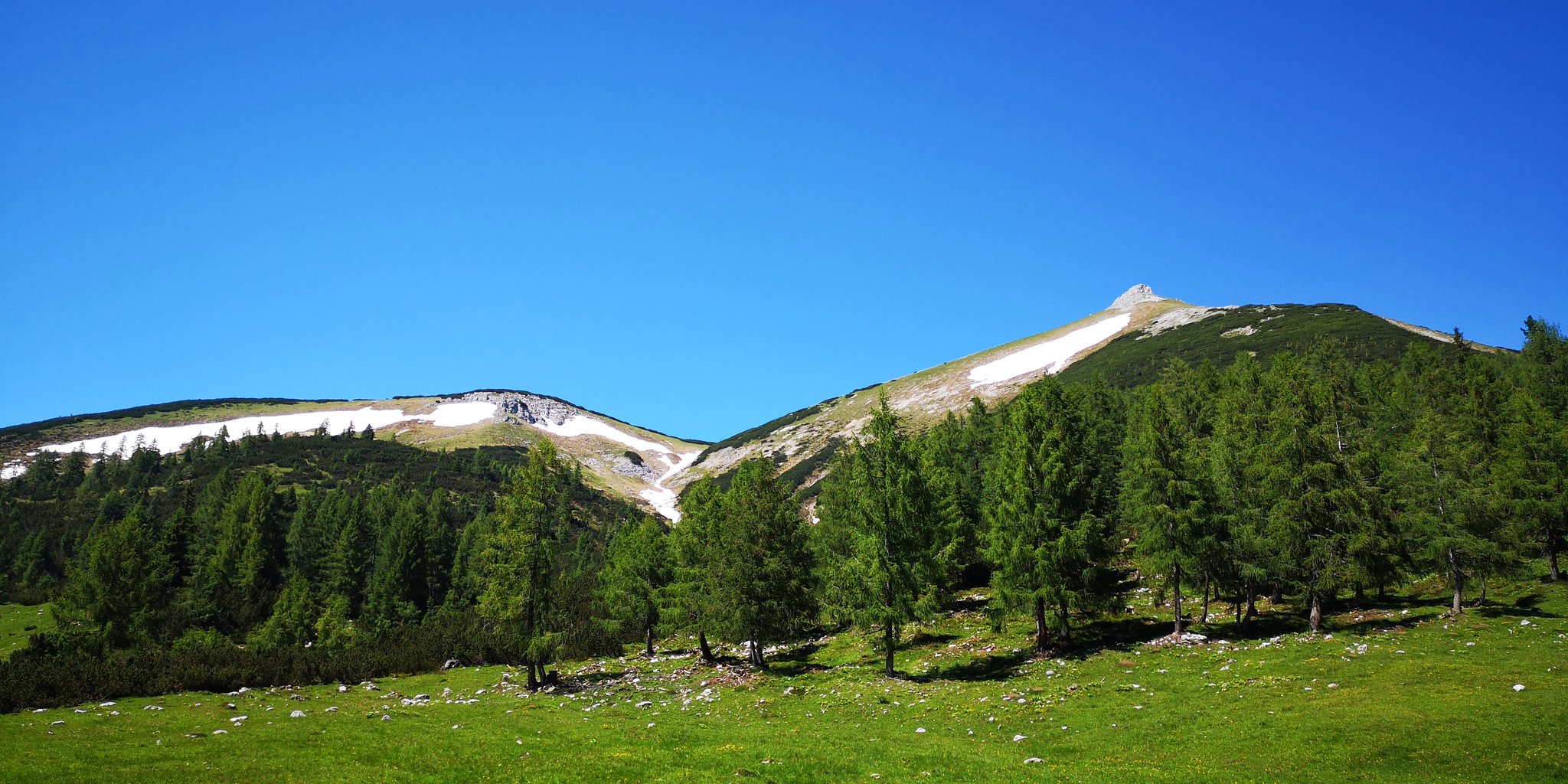 Nach der Jagdhütte beginnt ein wunderschönes flaches Teilstück über einen, im Sommer mit den verschiedensten Almblumen übersäten Almteppich. Immer wieder kreuzt ein kleiner Bach, der sich durch diesen Almboden schlängelt und den wir über einen kleinen Steg überqueren bis wir zur im Sommer ebenfalls bewirtschafteten Interhüttenalm gelangen.