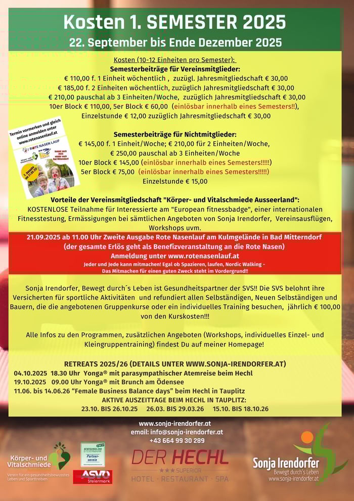 Der 10er und 5er Block ist für alle Präsenz- und Onlineeinheiten von Sonja Irendorfer einlösbar und gültig innerhalb eines Semesters. Für Mitglieder der Körper-und Vitalschmiede Ausseerland gibt es ermäßigte Preise. Vorraussetzung ist der Abschluss einer unterstützenden Mitgliedschaft zum Preis von € 30,00/jährlich.