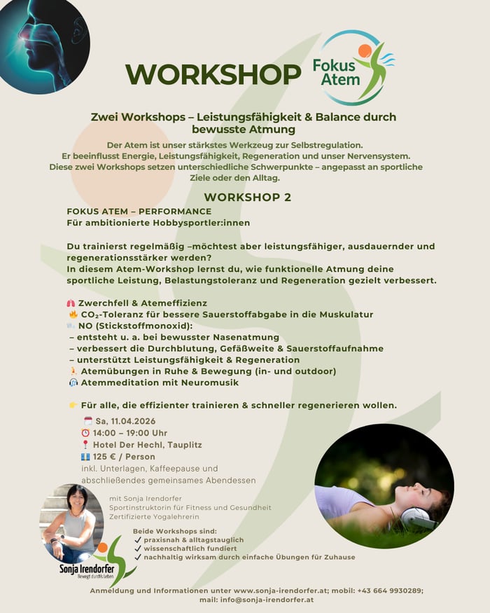 Du trainierst regelmässig und möchtest mit Hilfe der richtigen Atemtechnik leistungsfähiger, ausdauernder und regenerationsfähiger werden? Dann ist dieser Workshop genau das richtige für dich. Inhalte: Übungen zur Verbesserung der Innenwahrnehmung, Zwerchfelldehnung- und Kräftigung, Atemübungen in Ruhe und in Bewegung (in- und outdoor), parasympathische Atemreise mit Neurosound. Inklusivleistung: Workshop, Kaffeepause, gemeinsames Abendessen