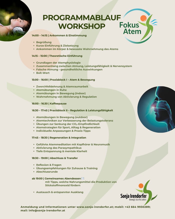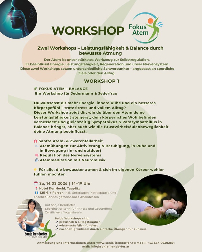 Halbtages Atemworkshop für Jedermann- und Frau für mehr Leistungsfähigkeit, mehr Energie, innere Ruhe und ein besseres Körpergefühl. Inhalte: Zwerchfelldehnung, Aktivierung Vagusnerv, Atemübungen in Ruhe und Bewegung, Atemmeditation mit Neurosound. Inklusivleistungen: Workshop, Kaffeepause, gemeinsames Abendessen als Abschluss