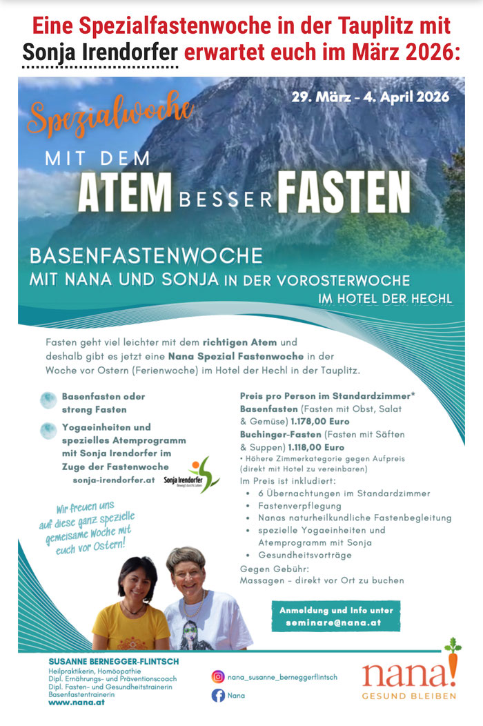 Vom 29.03. bis 04.04.26 erwartet euch eine Spezialfastenwoche von Nana mit dem Schwerpunkt Atmung! Buchungen direkt bei Nana über ihre Homepage unter