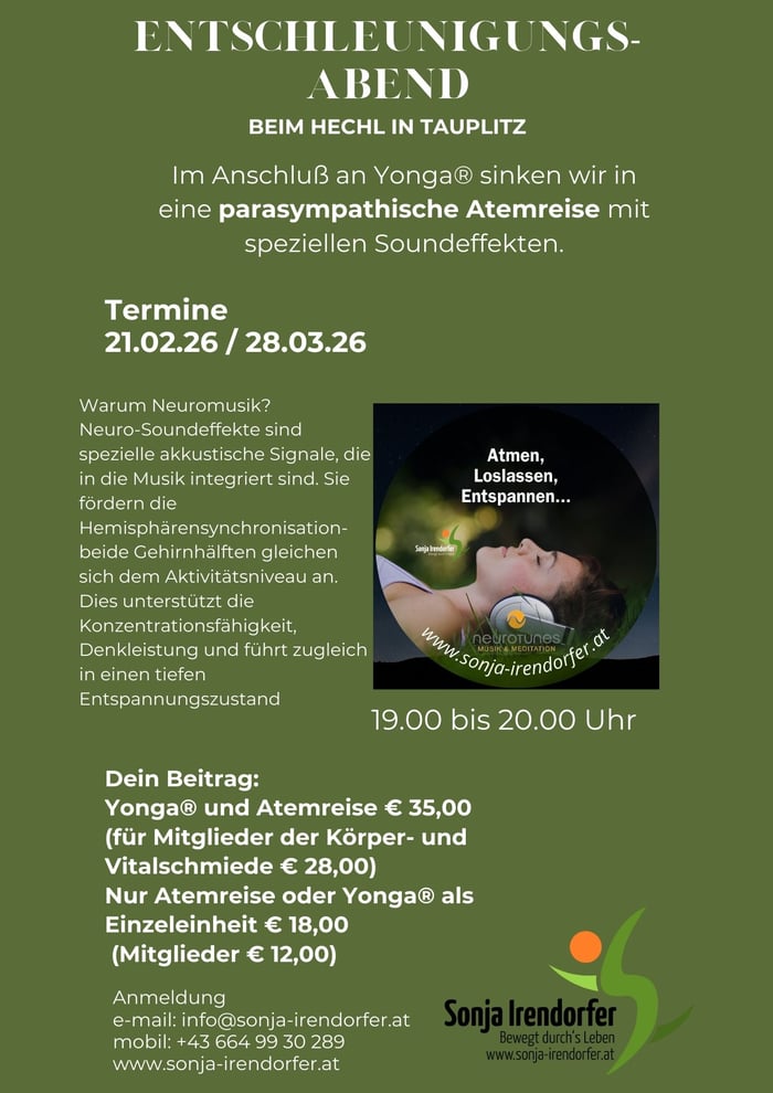 Yongaabend und parasympathische Atemreise mit Kopfhörer und Neurosound im Hotel Hechl in Tauplitz am 21.02.26 und 28.03.26, mit 45 Minuten Yonga und im Anschluss Meditation mit Kopfhörer
