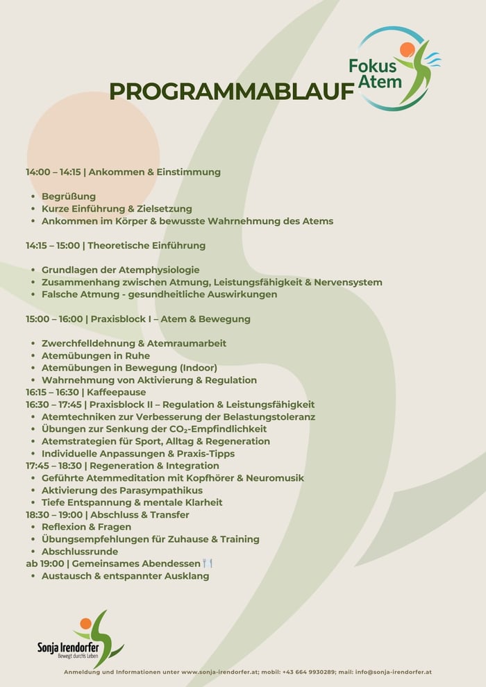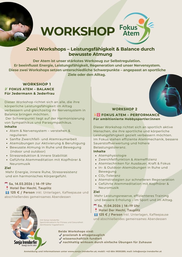 Der Atem ist unser stärkstes Werkzeug zur Selbstregulation. Er beeinflusst Energie, Leistungsfähigkeit, Regeneration und unser Nervensystem. Diese beiden Workshops setzen unterschiedliche Schwerpunkt - angepasst an sportliche Ziele oder den Alltag.
