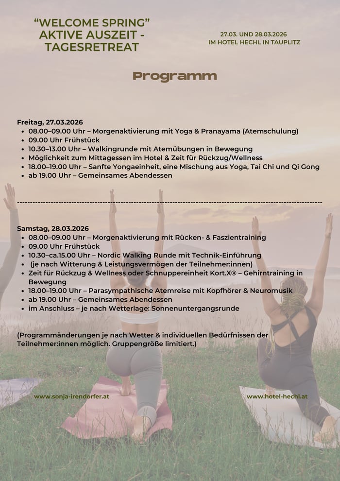 Inklusivleistungen: Morgen- und Abend Yoga/Yongaeinheit, Nordic Walking, Wellness, Verpflegung (Frühstück, Mittagsjause, Abendessen)